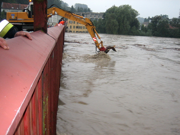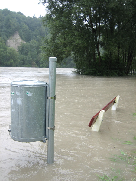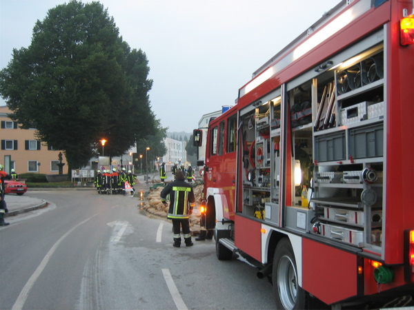 In Folge intensiver Regenfälle in Deutschland, Österreich und der Schweiz erreichte der Inn in Wasserburg gegen 11.30 Uhr einen Pegelstand von mehr als 5,50 Metern. Gegen 14.00 Uhr wurde schließlich die Feuerwehr Bachmehring zur Unterstützung der bereits im Einsatz befindlichen Kräfte der Stadtfeuerwehren alarmiert. Wegen des prognostizierten weiteren Pegelanstiegs lautete der Einsatzauftrag zunächst, einen Abschnitt des Inndamms zu überwachen. Um 20.00 Uhr, bei einem Pegelstand von bereits knapp 6,50 Metern, wurde die Füllstation für Sandsäcke der Bevölkerung an unseren Standort an den Parkplatz am Gries verlegt.