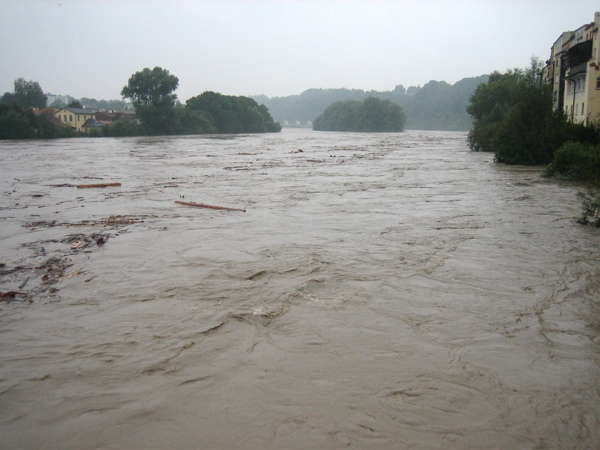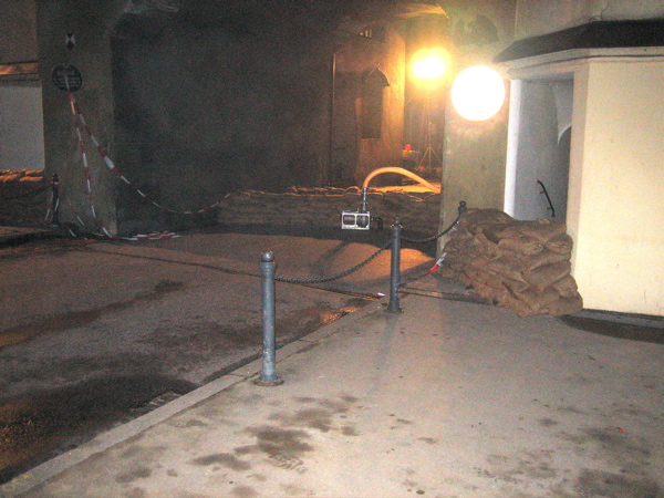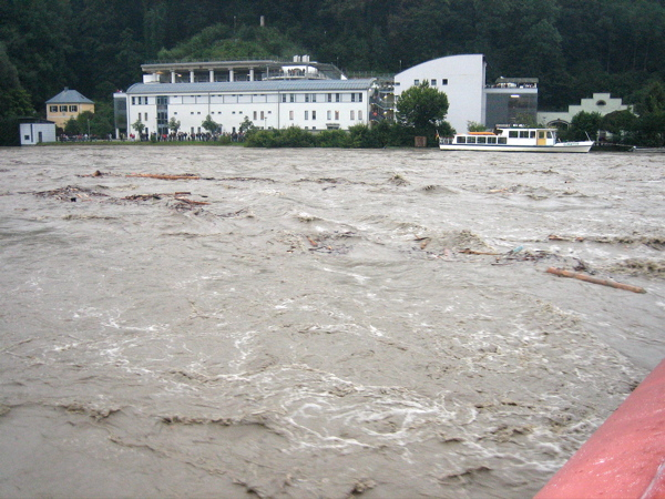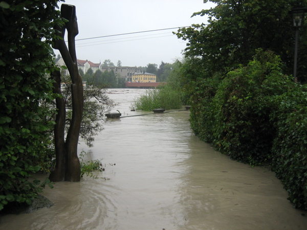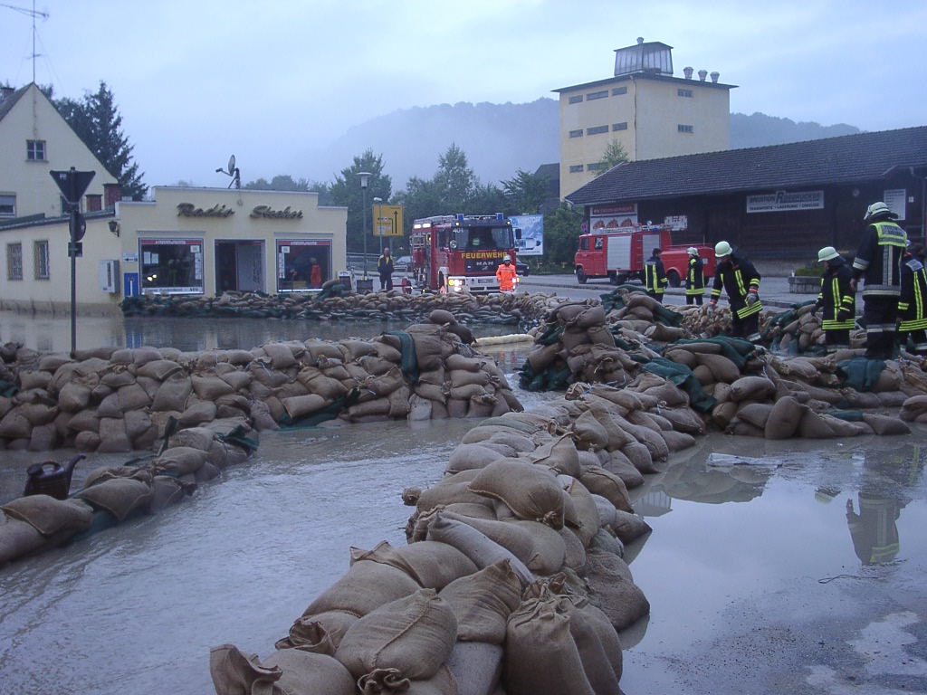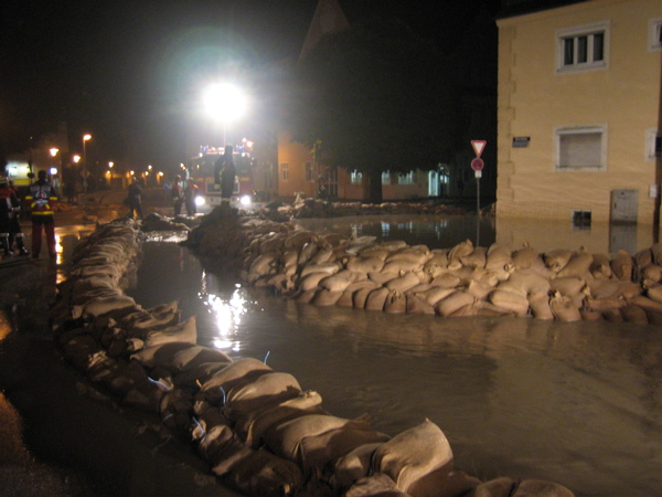 Die Lage spitze sich dann gegen 22.30 Uhr schlagartig dramatisch zu, als der Einsatzleitung am Knoppermühlweg (im Bereich unterhalb der Rampe) ein massiver Wassereinbruch gemeldet wurde. Umgehend eilten sämtliche verfügbaren Kräfte zur Schadensstelle und errichteten ein Notdamm aus Sandsäcken. Durch diesen konnte trotz eines Rekordpegels von mehr als 7,00 Metern ein weiteres Eindringen des Hochwassers in den Bereich der Wasserburger Altstadt erfolgreich verhindert werden.