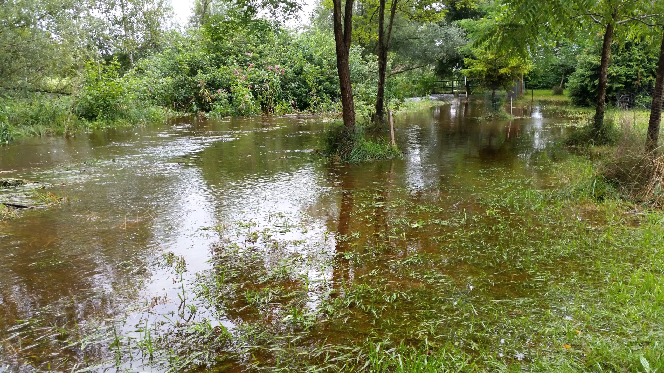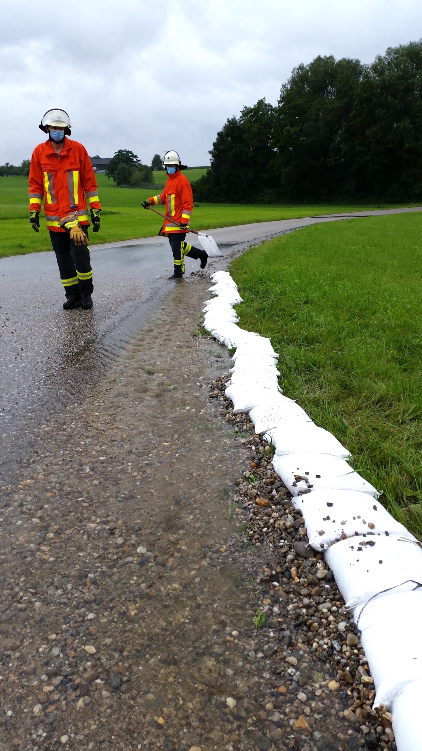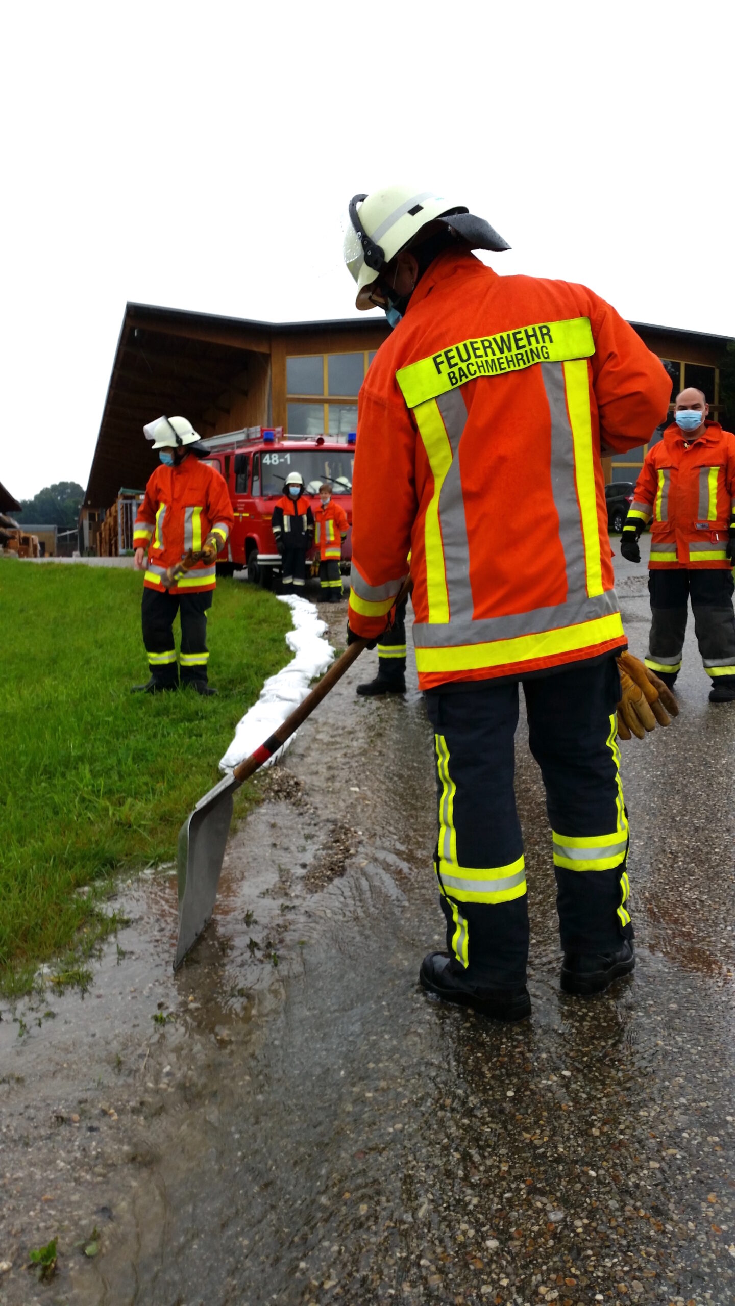 Nach intensiven Regenfällen mit zahlreichen Einsätzen im Landkreis Rosenheim erfolgte heute um 09.07 Uhr auch die Alarmierung der Feuerwehr Bachmehring. In der Dirnecker Straße waren zwei Grundstücke durch vom angrenzenden Hang strömendes Wasser überflutet worden – zwei Wohnhäuser waren dadurch akut gefährdet. Während mit Hilfe einer Pumpe der Wasserstand in den Gärten gesenkt werden konnte, wurde das Wasser oberhalb des Hangs durch Sandsäcke in einen angrenzenden Graben abgeleitet. Nach dem Erfolg dieser umfangreichen Maßnahmen erfolgte die Kontrolle der übrigen durch Hochwasser gefährdeten Stellen im Einsatzgebiet.