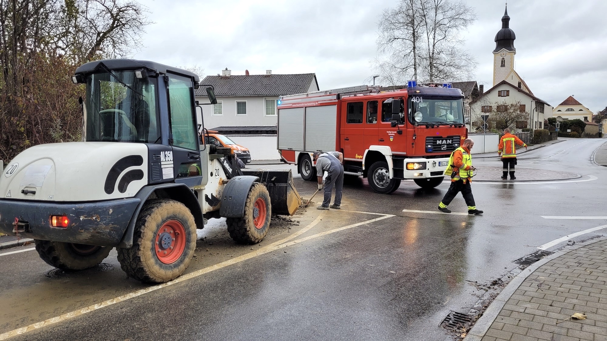 Nach einem technischen Defekt hatte ein Lastwagen am Kreisverkehr in der Ortsmitte eine größere Menge Steine und Kies verloren. Durch die Feuerwehr und den Kreisbauhof erfolgte die aufwendige Reinigung der Fahrbahn. Hierzu wurde auch ein kleiner Bagger eingesetzt. Während der Arbeiten musste die Ortsdurchfahrt teilweise gesperrt werden, es kam zu Verkehrsbehinderungen.