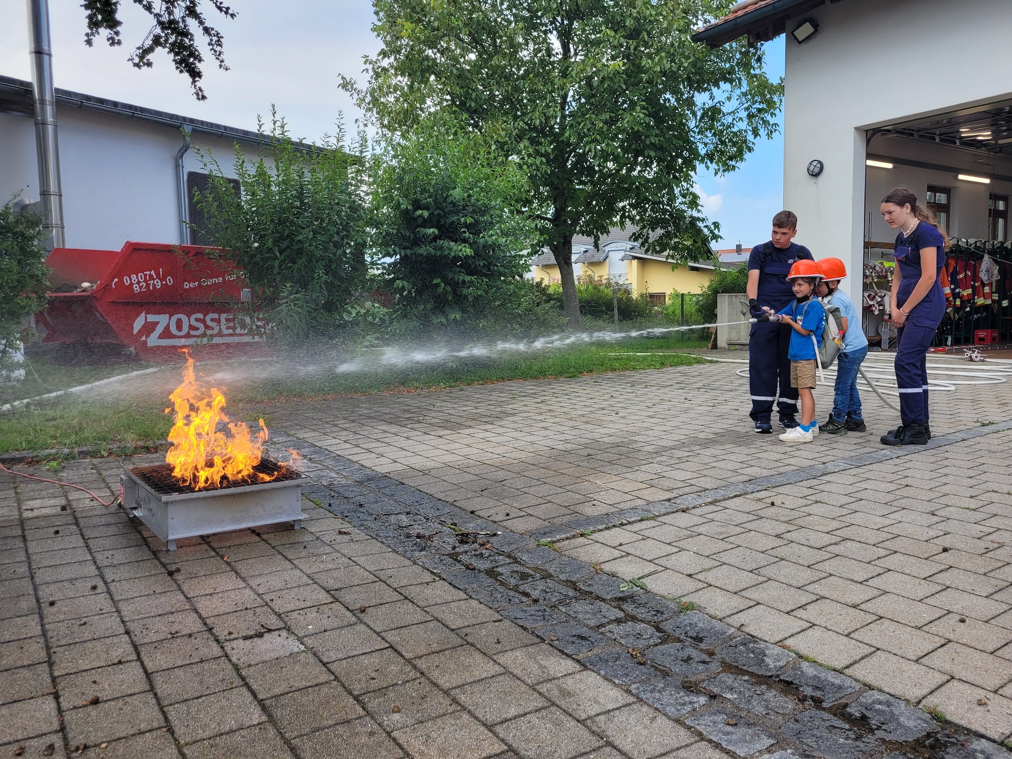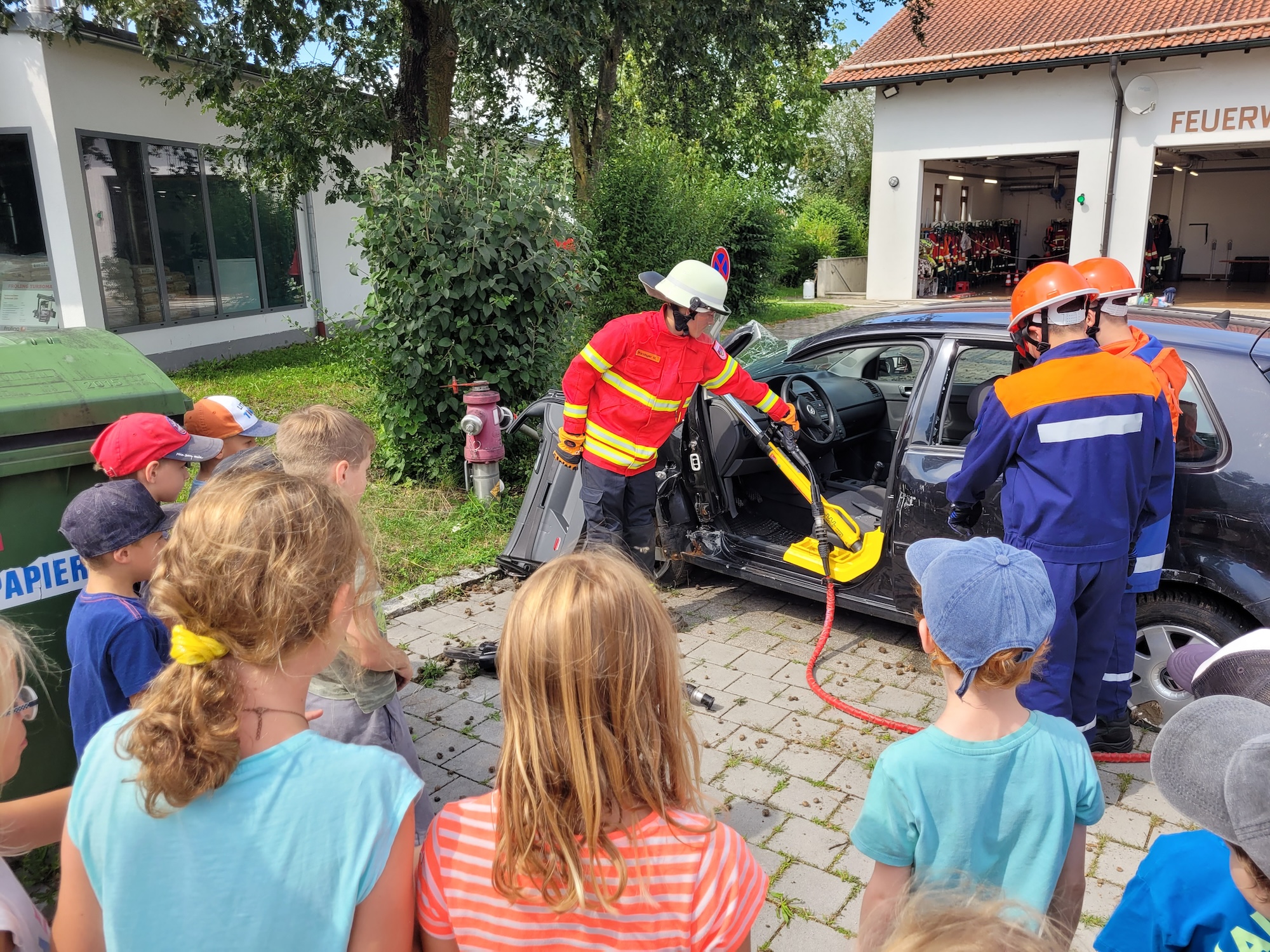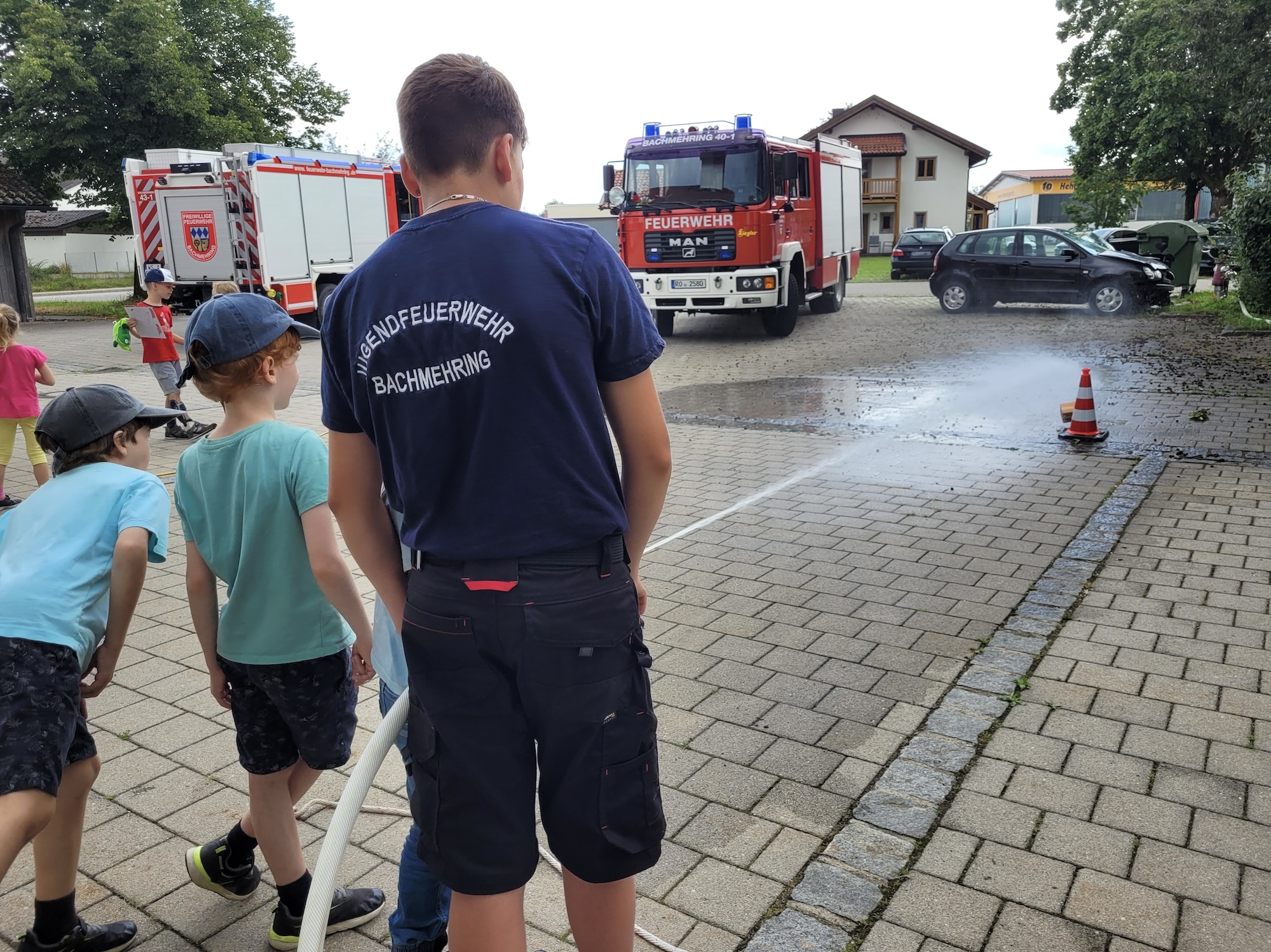 25 Kinder besuchten heute im Rahmen des diesjährigen Gemeindeferienprogramms die Feuerwehr Bachmehring. Sie konnten zunächst alle Fahrzeuge und die darin mitgeführte technische Ausrüstung erkunden. Dann erlebten sie einen realistischen Atemschutzeinsatz mit der Rettung vermisster Personen aus einer stark verrauchten Garage. Beim Absolvieren eines Geschicklichkeitsparcours mit dem Löschen echter Flammen konnten die jungen Besucher*innen auch gleich ihr persönliches Talent rund um die Brandbekämpfung mit Wasser beweisen. Außerdem durften sie die Rettungsschere an einem Schrott-Pkw ausprobieren und deren Kraft spüren. Von den aktiven Feuerwehrmitgliedern lernten die Kinder auch, wie man einen Notruf richtig absetzt und warum Rauchmelder im eigenen Zimmer Leben retten können. Zum Schluss stand dann selbstverständlich noch die heiß begehrte Rundfahrt mit den großen Löschfahrzeugen auf dem abwechslungsreichen Programm.