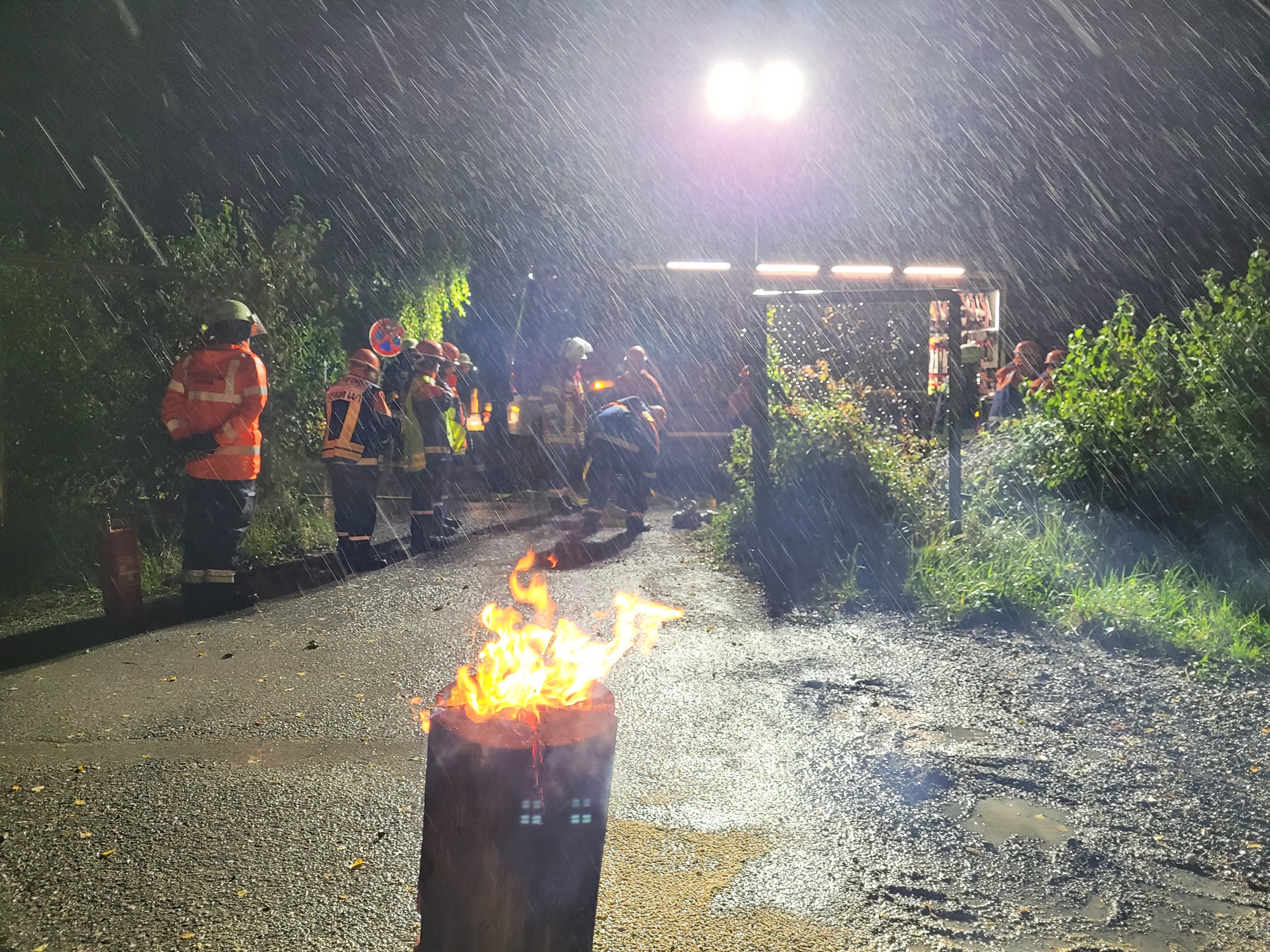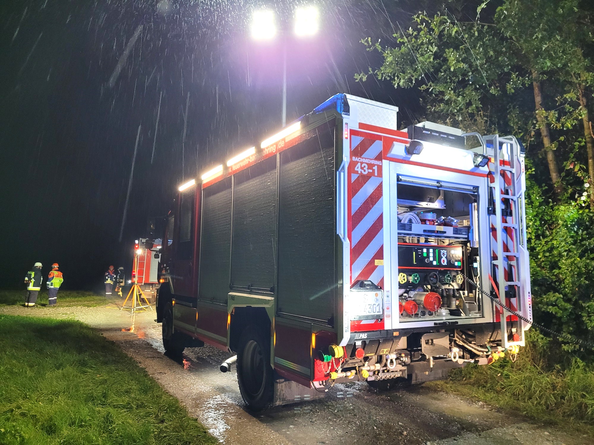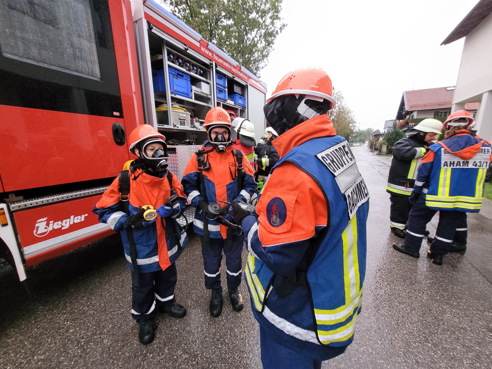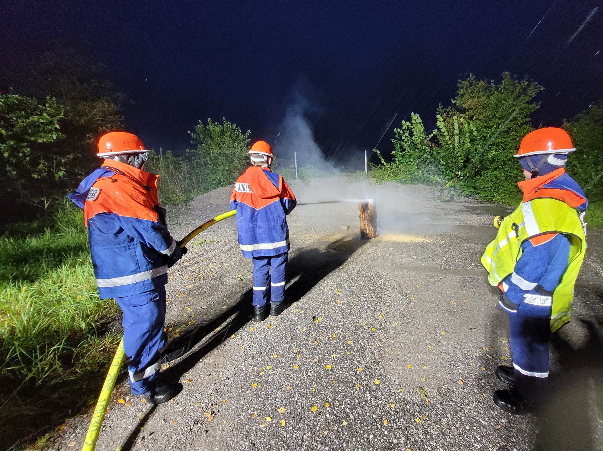 Im Anschluss konnten dann einige Szenarien, wie vorgesehen, durchgeführt werden. So galt es, nahe Alteiselfing einen angenommenen Verkehrsunfall abzusichern, auszuleuchten und eine vermisste Person in der Dunkelheit zu finden. Nach einer kurzen Nacht musste ein Kleinbrand neben dem Wertstoffhof in Hafenham abgelöscht werden, ehe in Eiselfing eine Rauchentwicklung in einem Gebäude gemeldet wurde. Neben einem fiktiven Atemschutzeinsatz war auch eine verletzte Person zu versorgen und per Trage zu retten.