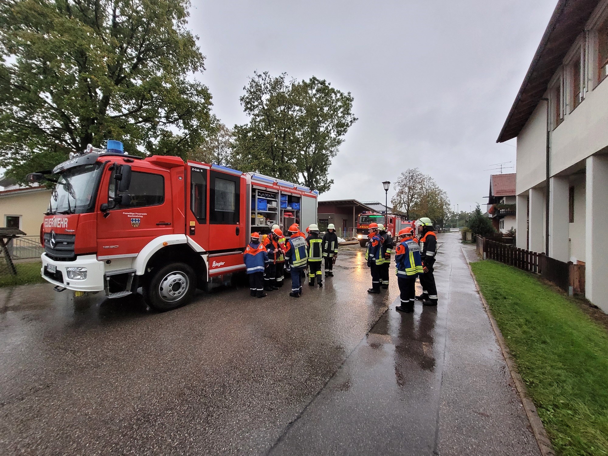 Bevor nach einem ausgiebigen Frühstück am Samstagvormittag dann der nächste Übungsalarm erfolgten konnte, hielt die Realität wieder Einzug. Aufgrund ergiebiger Niederschläge erreichten die aktiven Feuerwehrkräfte die ersten realen Hochwassereinsätze in der Osenahamer Straße und am Schwarzmoosbach in Bachmehring. In der weiteren Folge drohte dann die Murn in Aham nach dem Überfluten einer Pferdekoppel und eines Stallgebäudes großflächig über die Ufer zu treten.