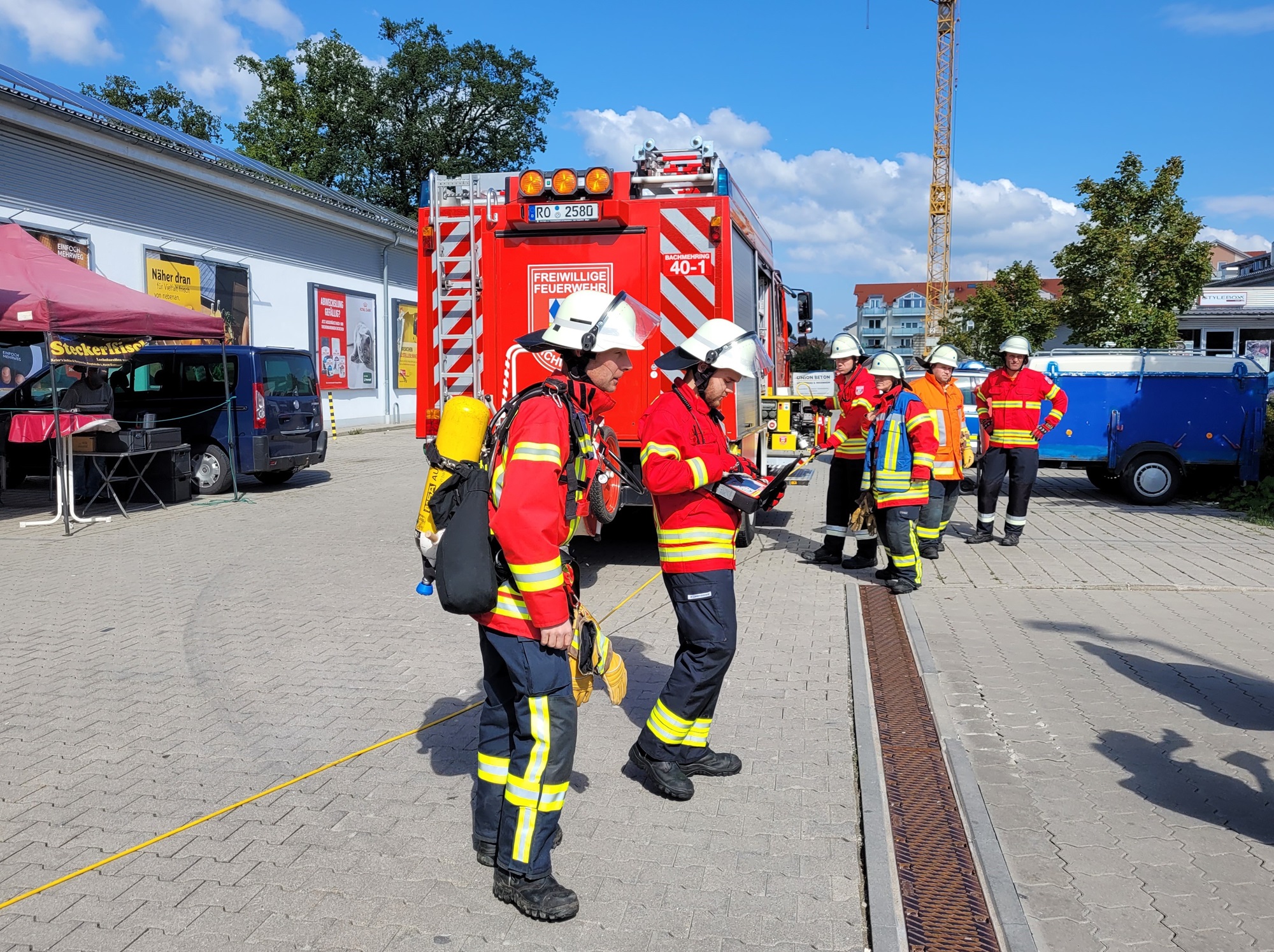 Nach einem technischen Defekt war eine größere Menge Kühlmittel ausgetreten und der dazugehörige Dampf verteilte sich rasch im öffentlichen Verkaufsbereich. Das Personal reagierte vorbildlich und evakuierte umgehend den gesamten Markt. Ein Atemschutztrupp der Feuerwehr Bachmehring erkundete den betroffenen Bereich und brachte dabei auch ein Gasmessgerät zum Einsatz. Im Anschluss nahmen die Feuerwehren mehrere Spezialgeräte zum umfangreichen Belüften des Gebäudes vor.