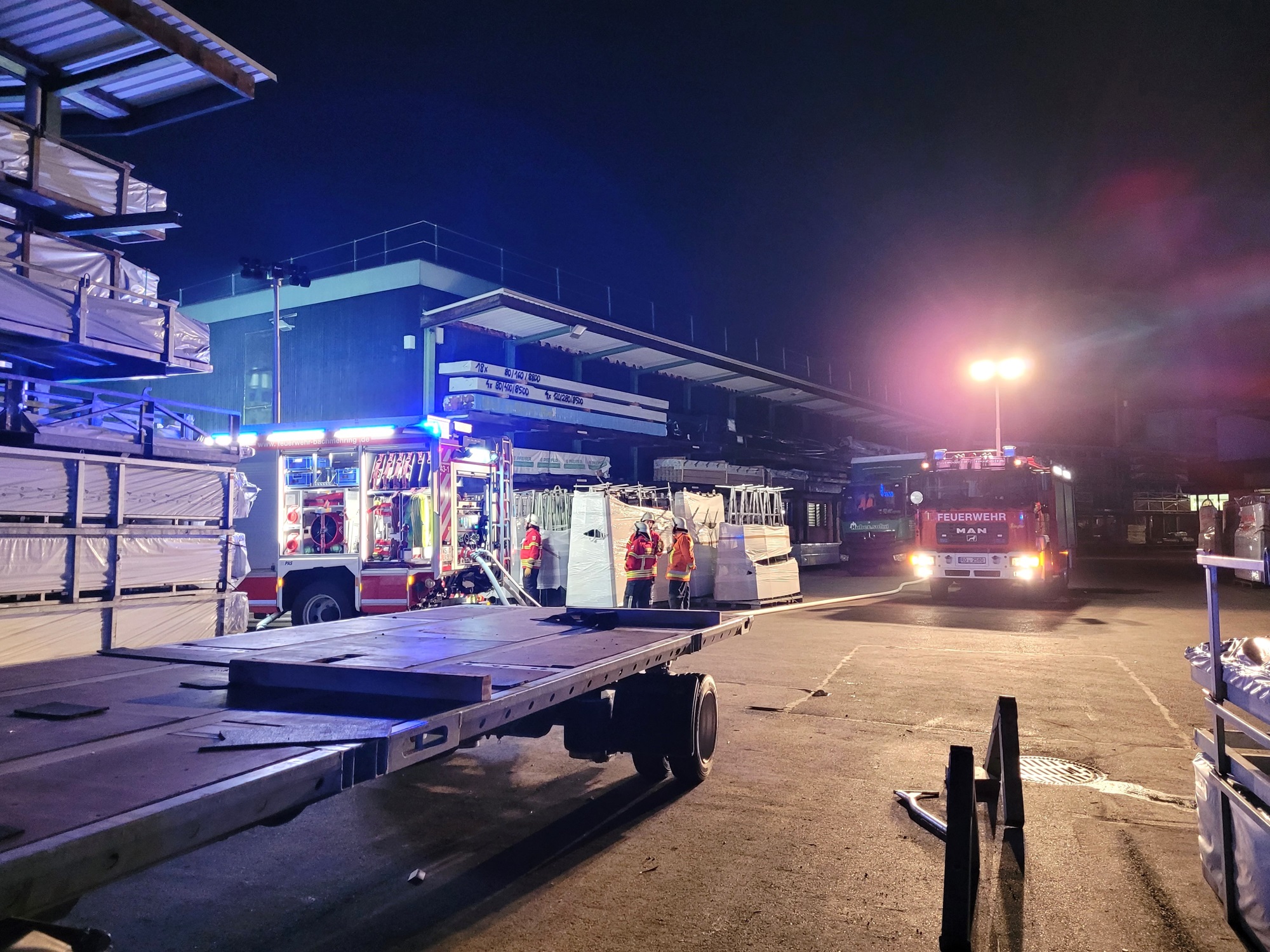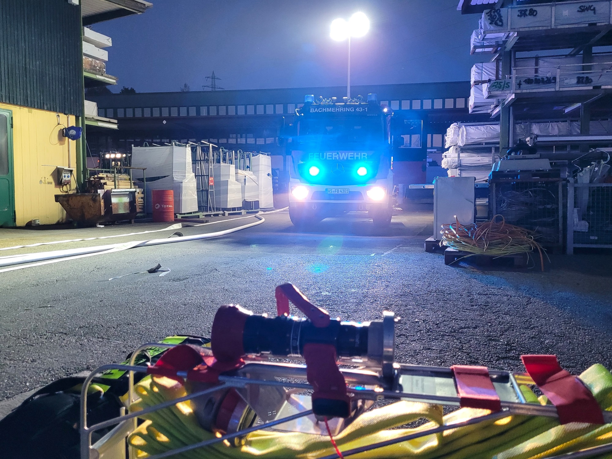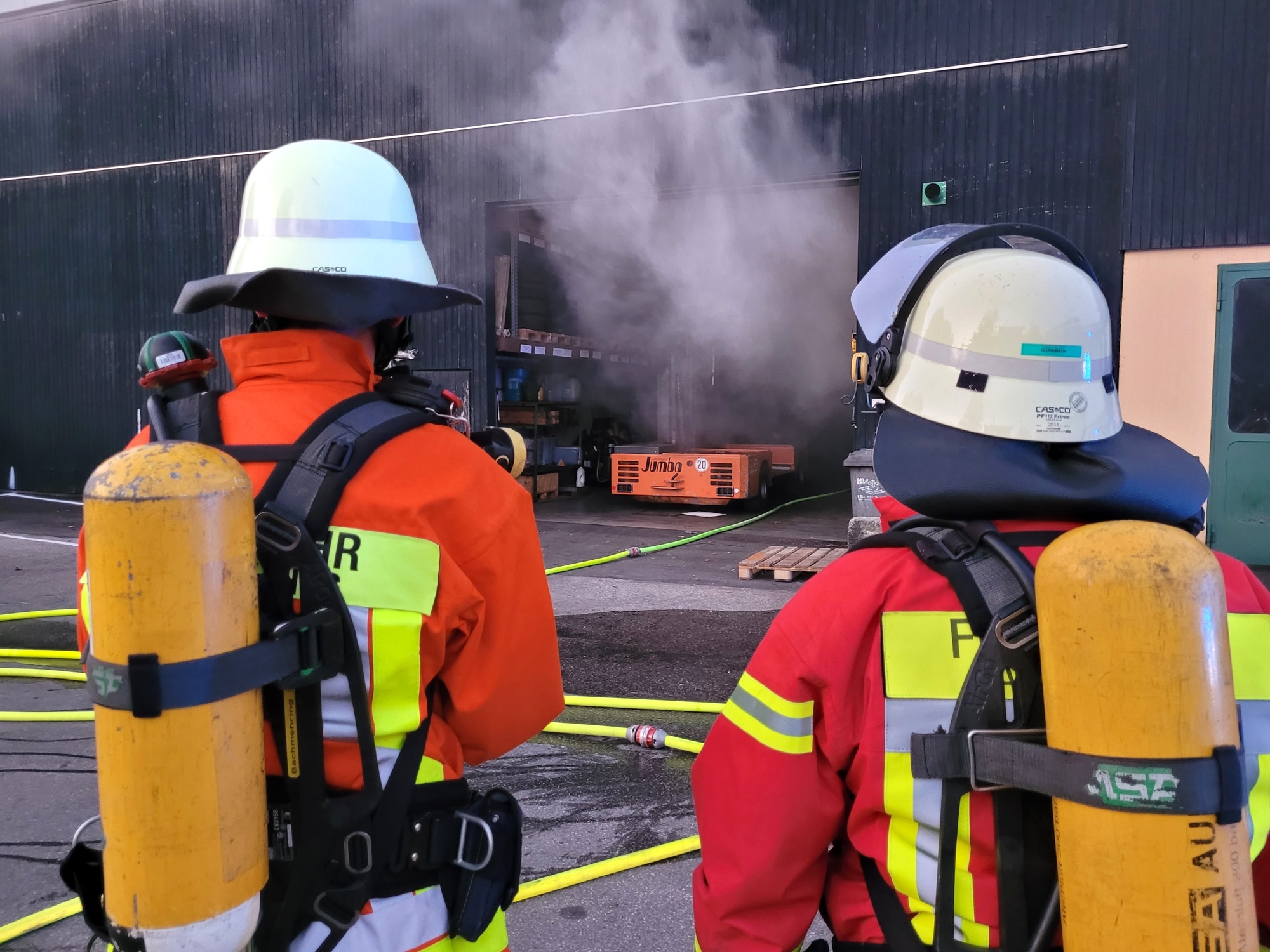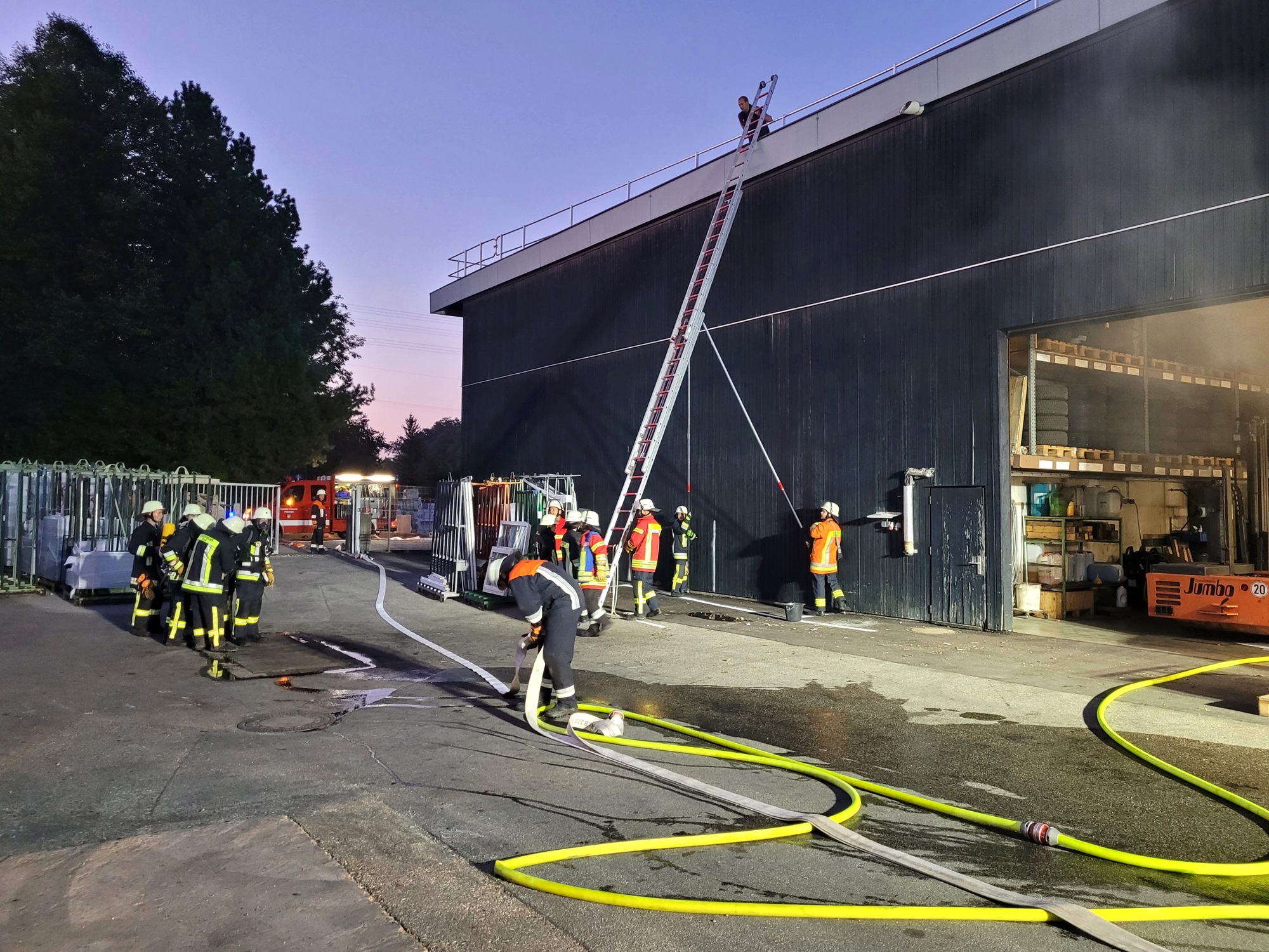 Mehrere Atemschutztrupps betraten dieses umgehend von zwei Seiten, leiteten einen Löschangriff ein und übernahmen die Personensuche. Parallel dazu tauchte plötzlich noch ein weiterer Firmenmitarbeiter auf, der in Panik auf das Hallendach geflüchtet war und von dort per Schiebeleiter gerettet werden musste. Außerdem bauten die Feuerwehren mittels Tragkraftspritzen und Schlauchleitungen eine umfassende Löschwasserversorgung auf.