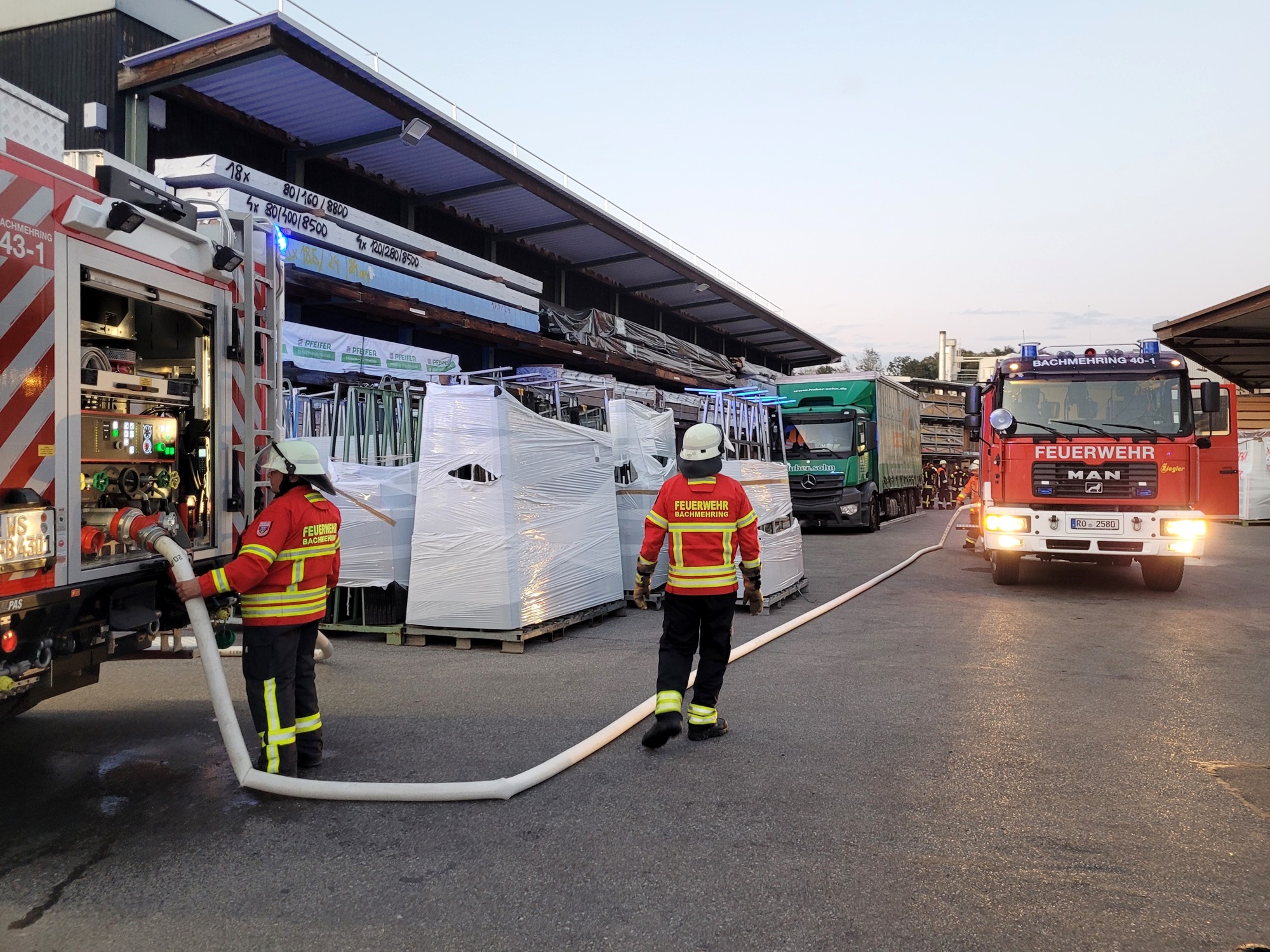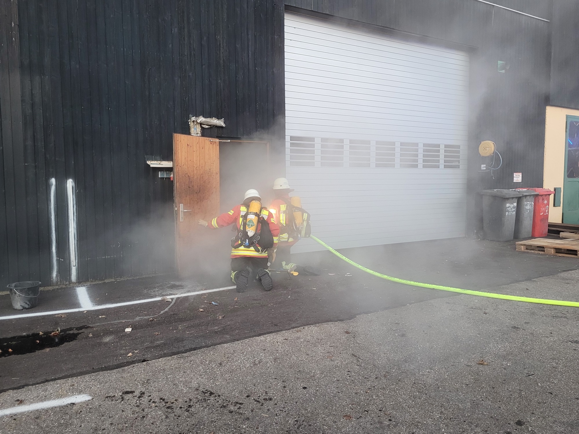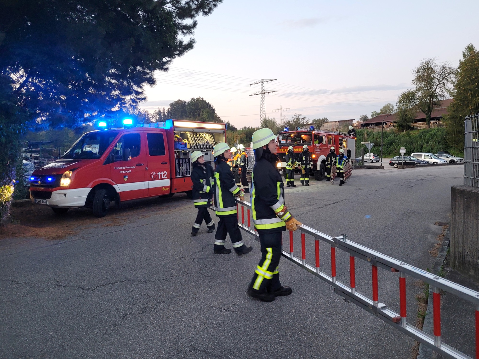 Sofort machten sich die Feuerwehren aus Aham, Bachmehring, Freiham und Schönberg jeweils von ihren Standorten auf den Weg zum Einsatzort. Dort war eine massive Rauchentwicklung festzustellen und aufgeregte Mitarbeiter*innen berichteten von zwei vermissten Kolleg*innen im betroffenen Gebäude.