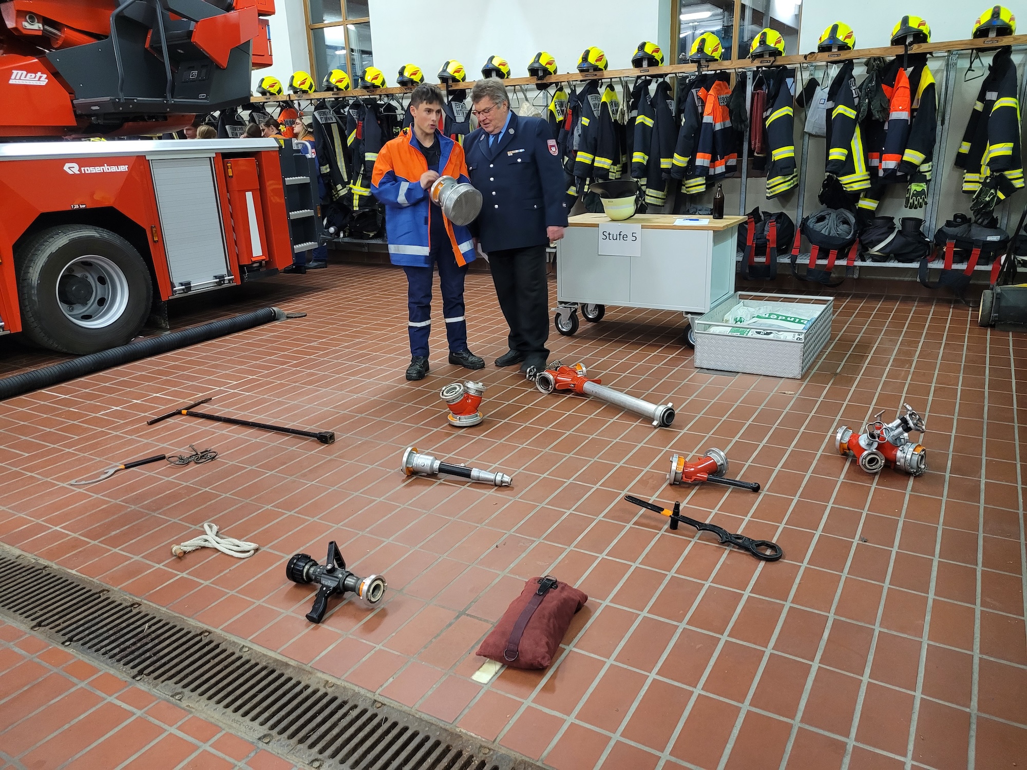 Nach mehrwöchiger Vorbereitung durch ihre Ausbilder*innen mussten die Feuerwehranwärter*innen im Alter zwischen zwölf und 18 Jahren je nach abgelegter Leistungsstufe Theoriefragen und praktische Stationen absolvieren. So wurde beispielsweise Fachwissen zu den verschiedenen Feuerwehrfahrzeugkategorien und deren typischen Einsatzzwecken getestet. Und Standardausrüstung, wie Strahlrohr, Hydrantenschlüssel, Feuerwehrleine oder Steckleiter musste bezüglich der sicheren Handhabung im Einsatz erläutert werden.