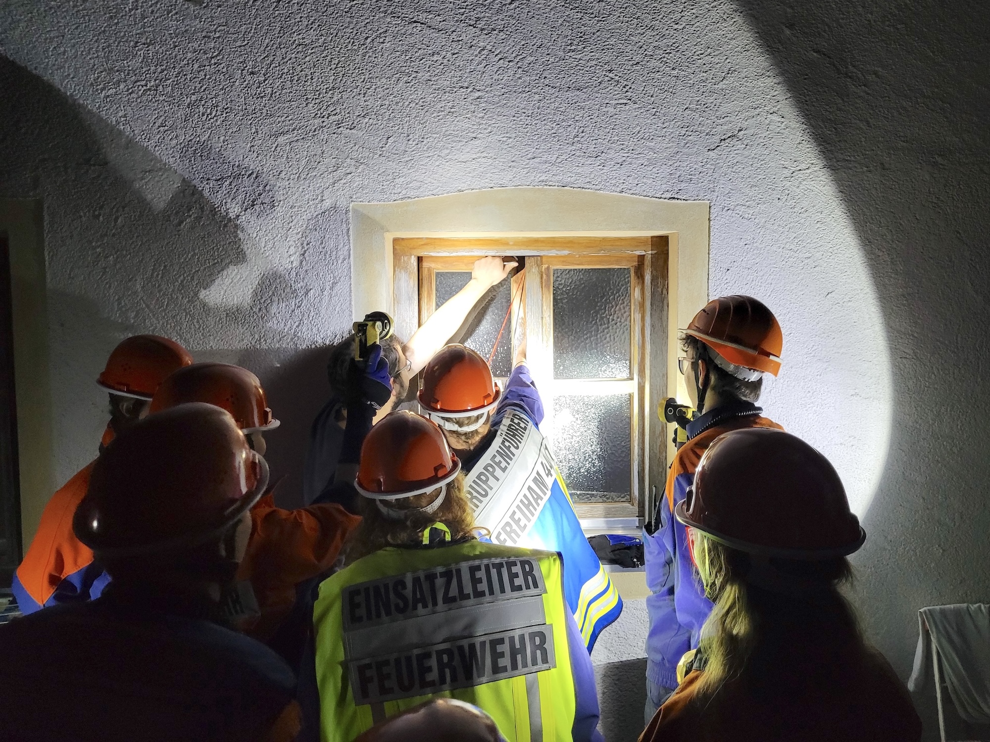 Ausgehend vom gemeinsamen Stützpunkt am Gerätehaus in Eiselfing erwarteten die Feuerwehranwärter*innen vom Freitag- bis zum Samstagnachmittag mehrere spannende Übungseinsätze. Los ging es mit einem großen Feuer und meterhohen Flammen auf einem Lagerplatz, die gelöscht werden mussten. Nach dem gemeinsamen Abendessen lautete die Alarmmeldung: „Dringende Wohnungsöffnung, Person in Notlage.“ Am Einsatzort angekommen, staunten die Nachwuchsretter*innen dann nicht schlecht. Warteten vor dem Gebäude doch drei Beamt*innen der Polizeiinspektion Wasserburg am Inn, um das Szenario gemeinsam mit den Jugendlichen zu bewältigen und dabei aus ihrem Berufsalltag über die wichtige Zusammenarbeit mit den heimischen Feuerwehren zu berichten.