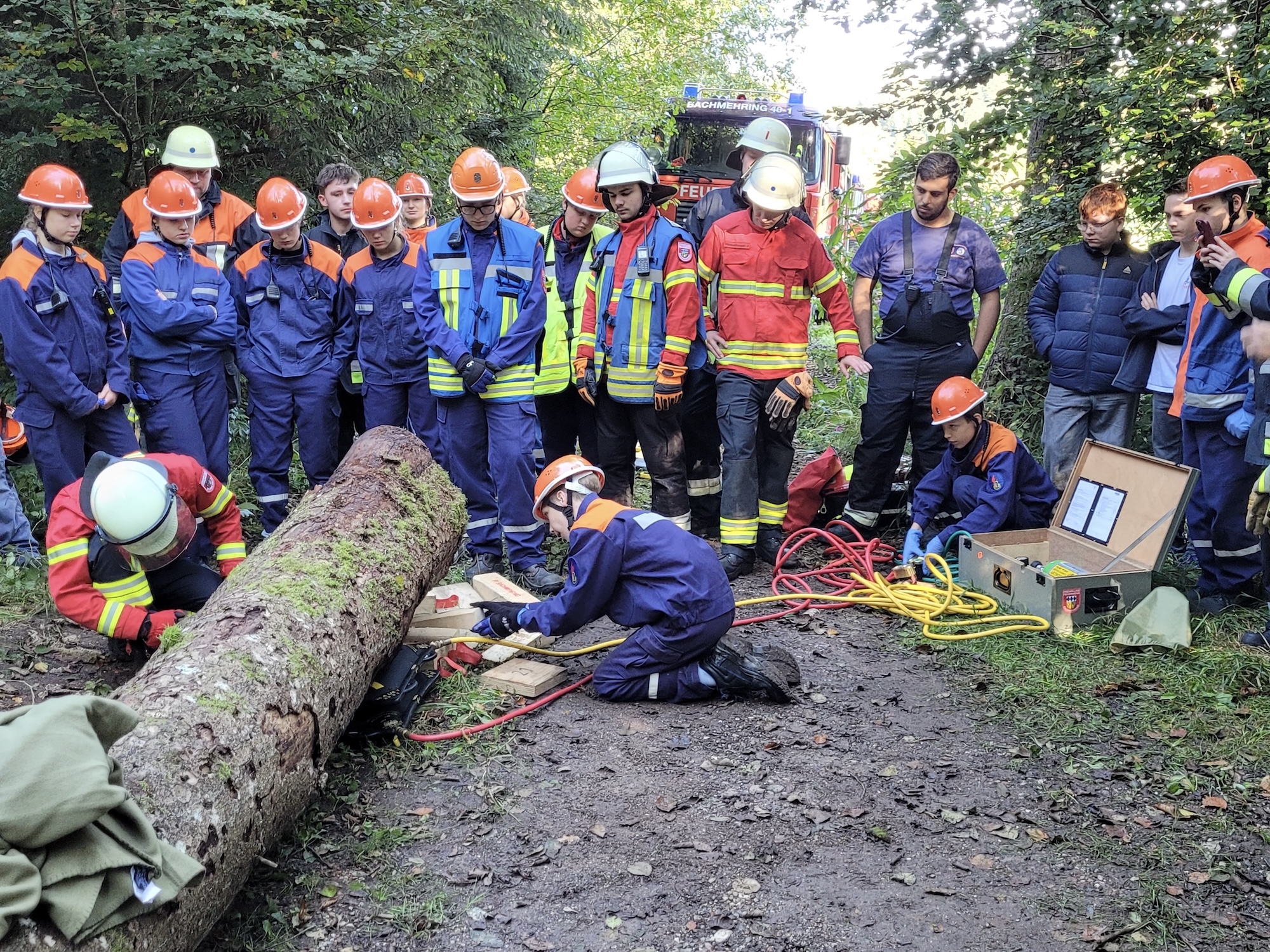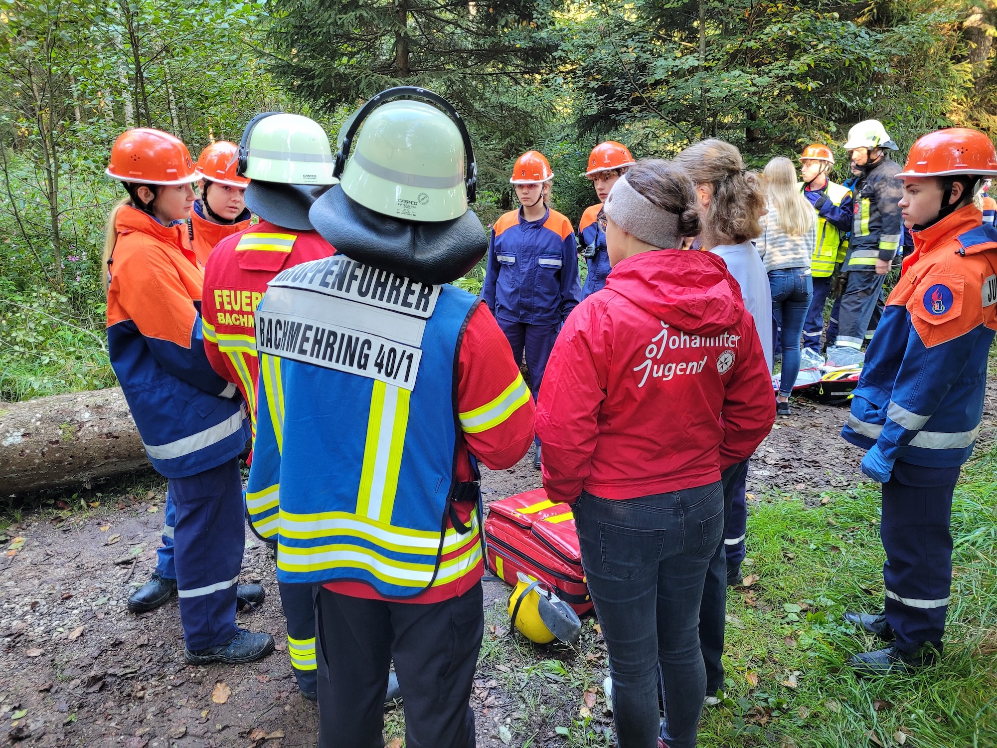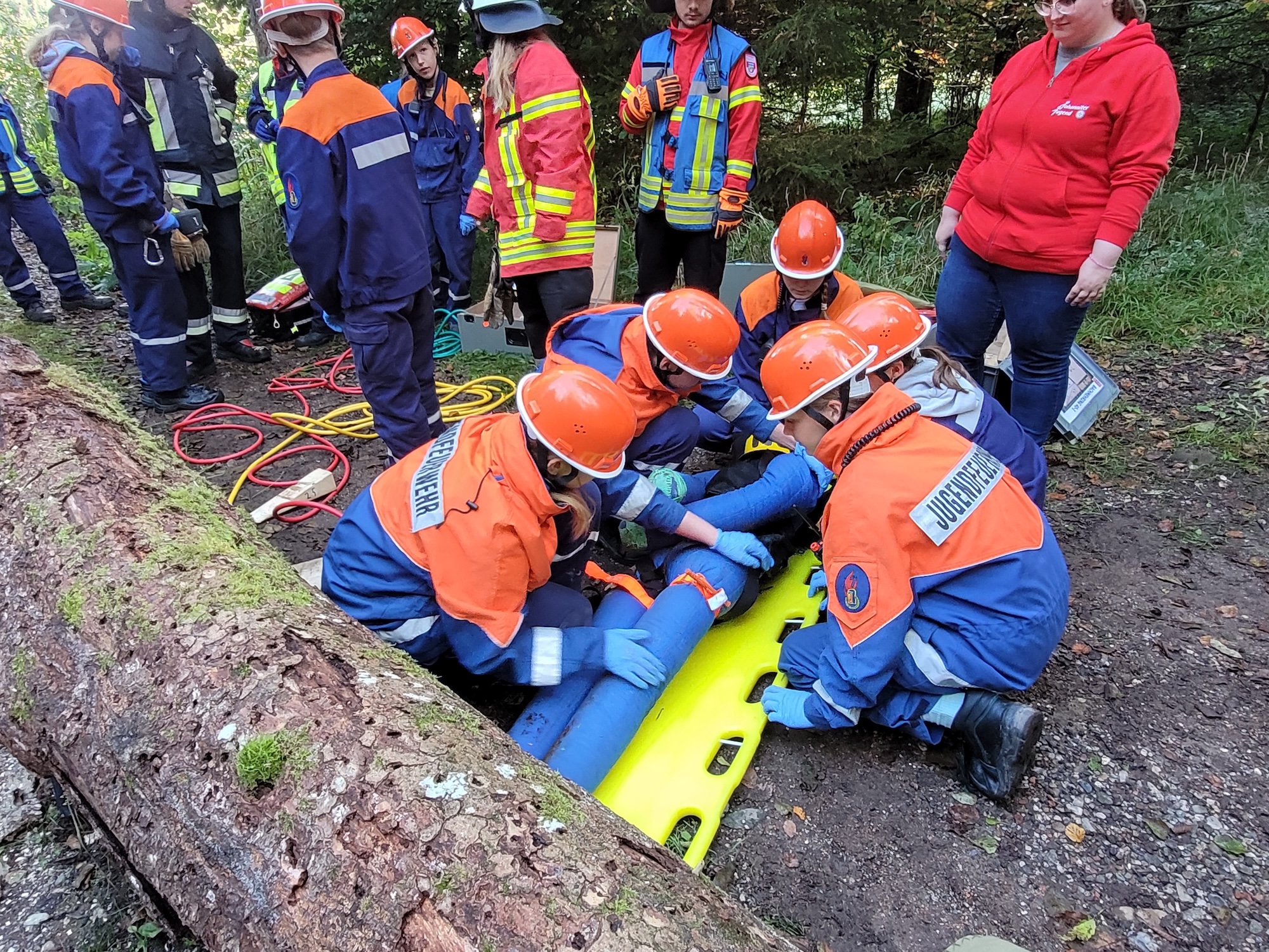 Es folgten die nächtliche Suche einer vermissten Person in einem Waldstück und eine ausgelöste Brandmeldeanlage im Eiselfinger Rathaus. Außerdem musste ein Handwerker aus einer Baugrube neben dem Schulhaus gerettet werden und bei Alteiselfing forderte ein Forstunfall die schnelle Rettung einer eingeklemmten Person. Hier trafen die Jugendfeuerwehrler*innen mit der Wasserburger Johanniter-Jugend zusammen und bewältigten das anspruchsvolle Szenario gleich noch mit professioneller medizinischer Notfallversorgung.