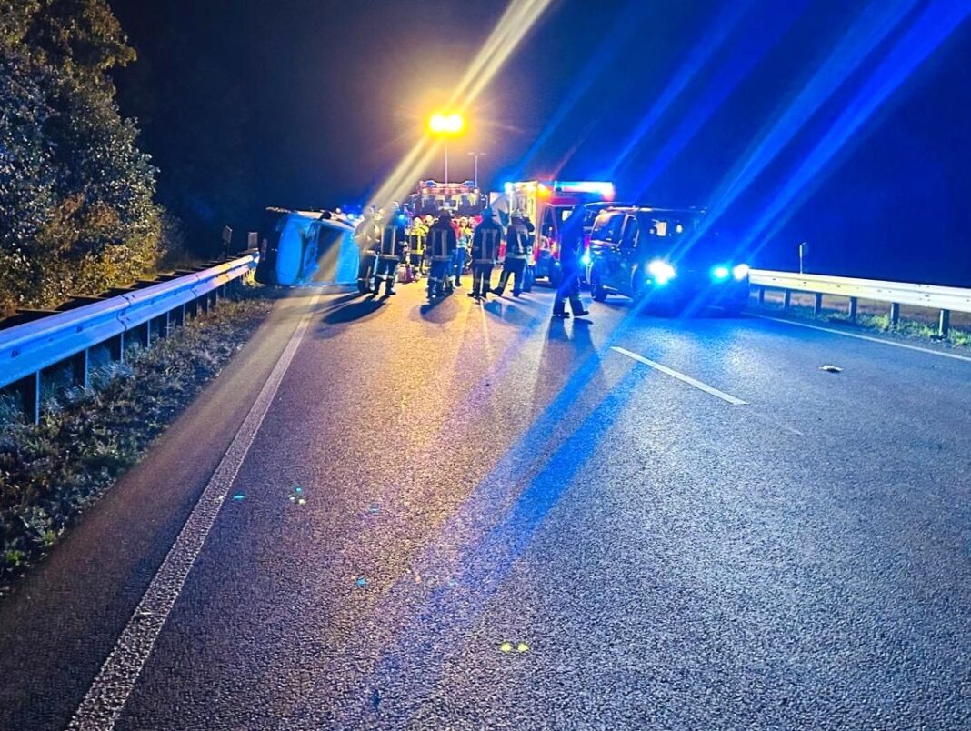 Der Fahrer war entgegen der Erstmeldung nicht eingeklemmt und konnte durch die Frontscheibe aus dem Wagen befreit werden. Er musste mit Verdacht auf schwere Verletzungen vom Rettungsdienst in ein Krankenhaus gebracht werden. Die Bundesstraße war zeitweise zur Unfallaufnahme und Bergung des Fahrzeugs komplett gesperrt.