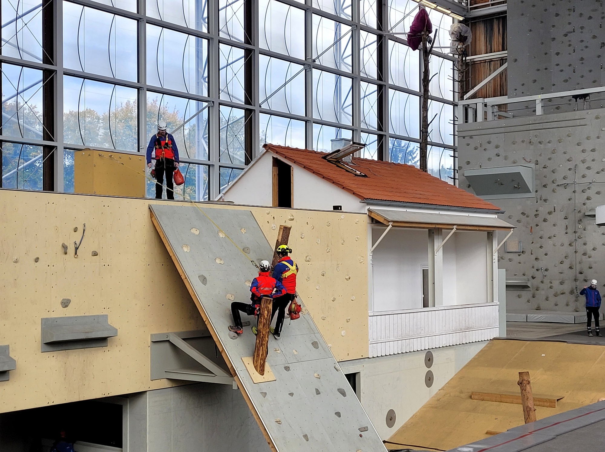 Das 2009 in den Regelbetrieb gegangene und weltweit einzigartige Simulationszentrum bietet den aktiven Mitgliedern der Bergwacht sowie weiteren internationalen Rettungsorganisationen realitätsgetreue Übungsszenarien aus den Bereichen Luft, Wasser und Höhle. Franz Seidinger, selbst Mitglied der Bergwacht Wasserburg am Inn und zugleich aktiver Feuerwehrler in Bachmehring, hatte den Besuch ermöglicht und führte die Gäste fachkundig durch das Zentrum. Die Feuerwehranwärter*innen konnten dabei unter anderem Übungen der am Hubschrauber hängenden Luftretter miterleben oder selbst einen Blick in den „Bergwetterraum“ werfen, der Trainingseinheiten bei bis zu minus 20 Grad mit Nebel, Wind und Regen ermöglicht.