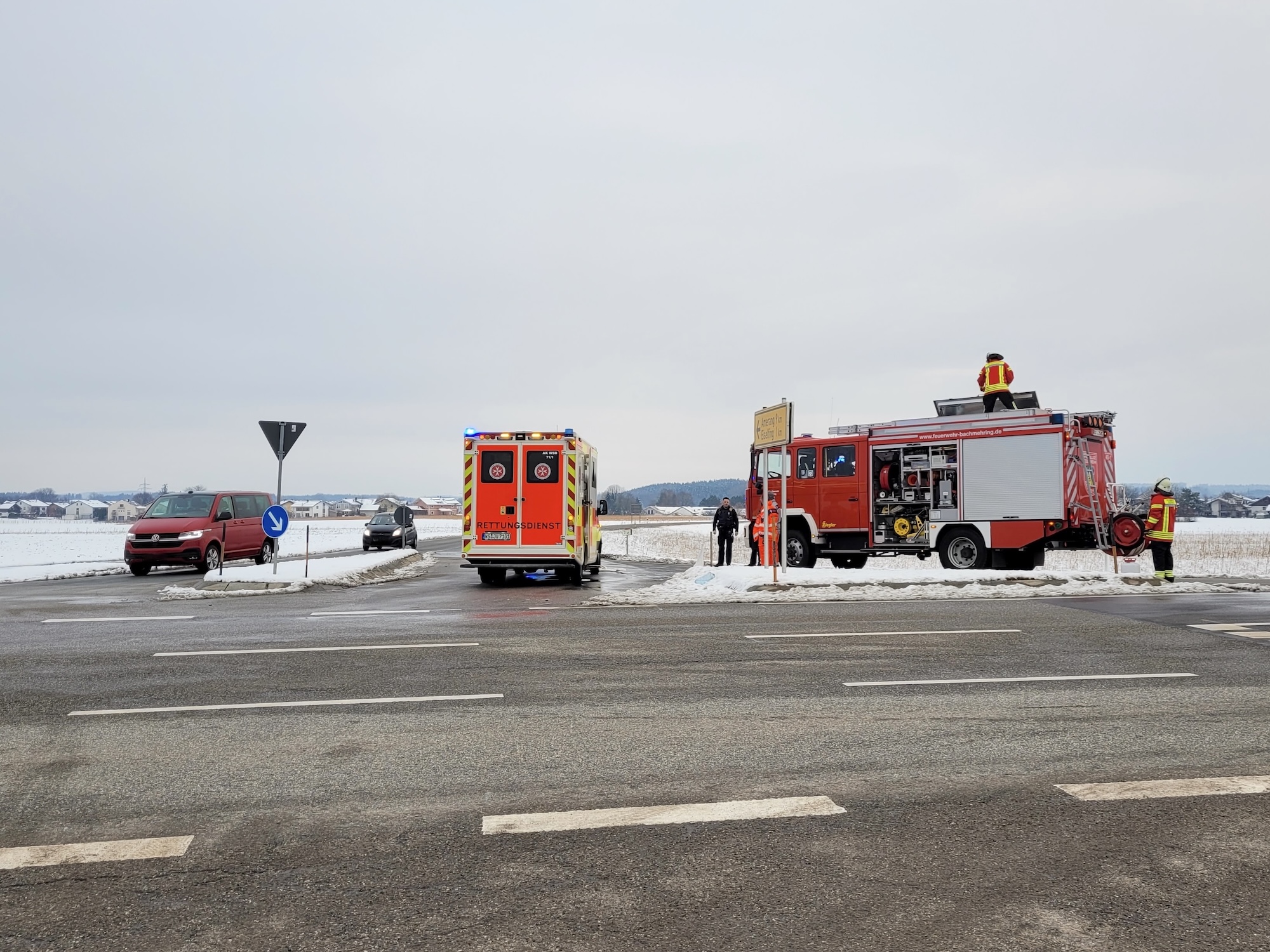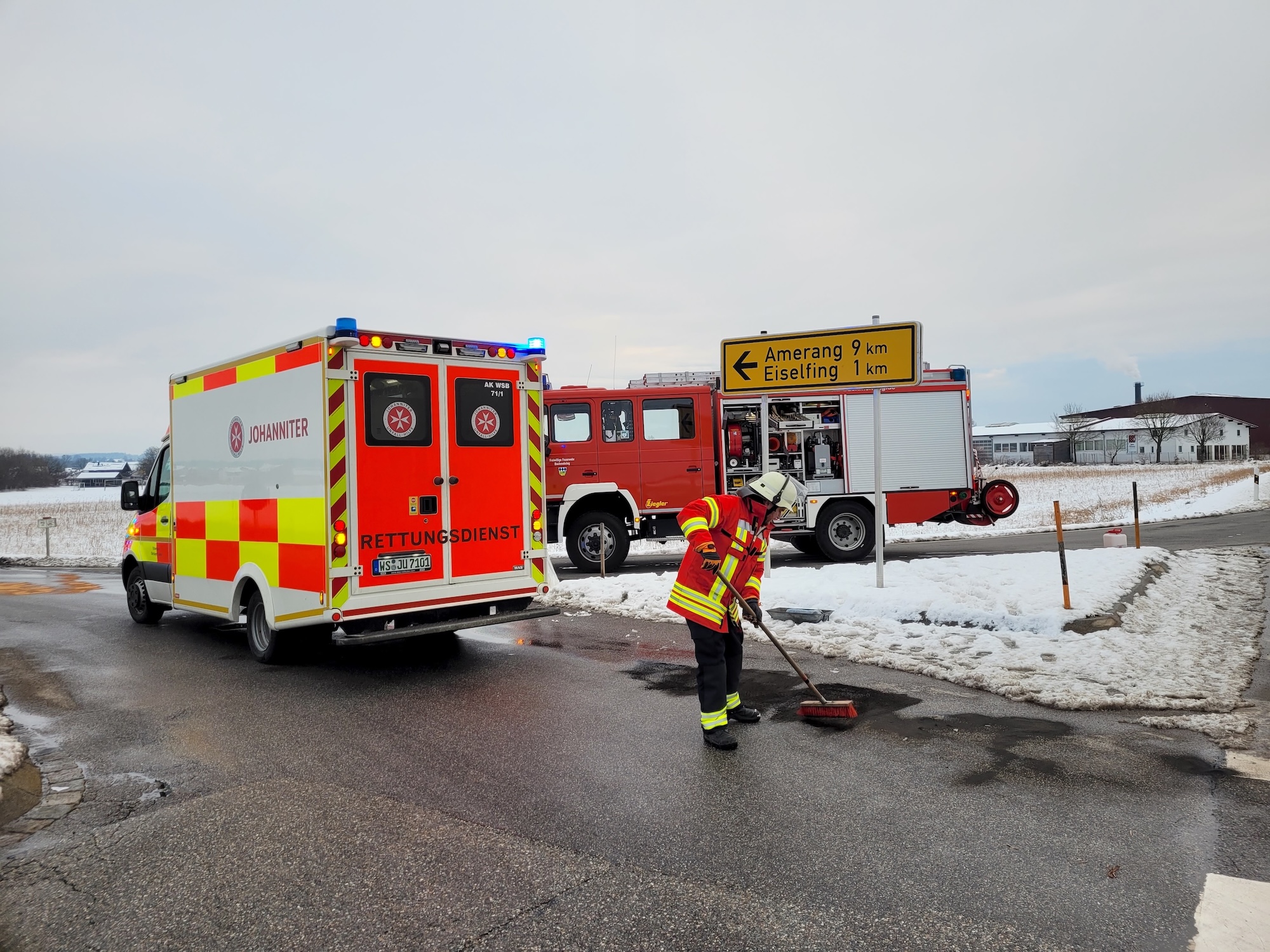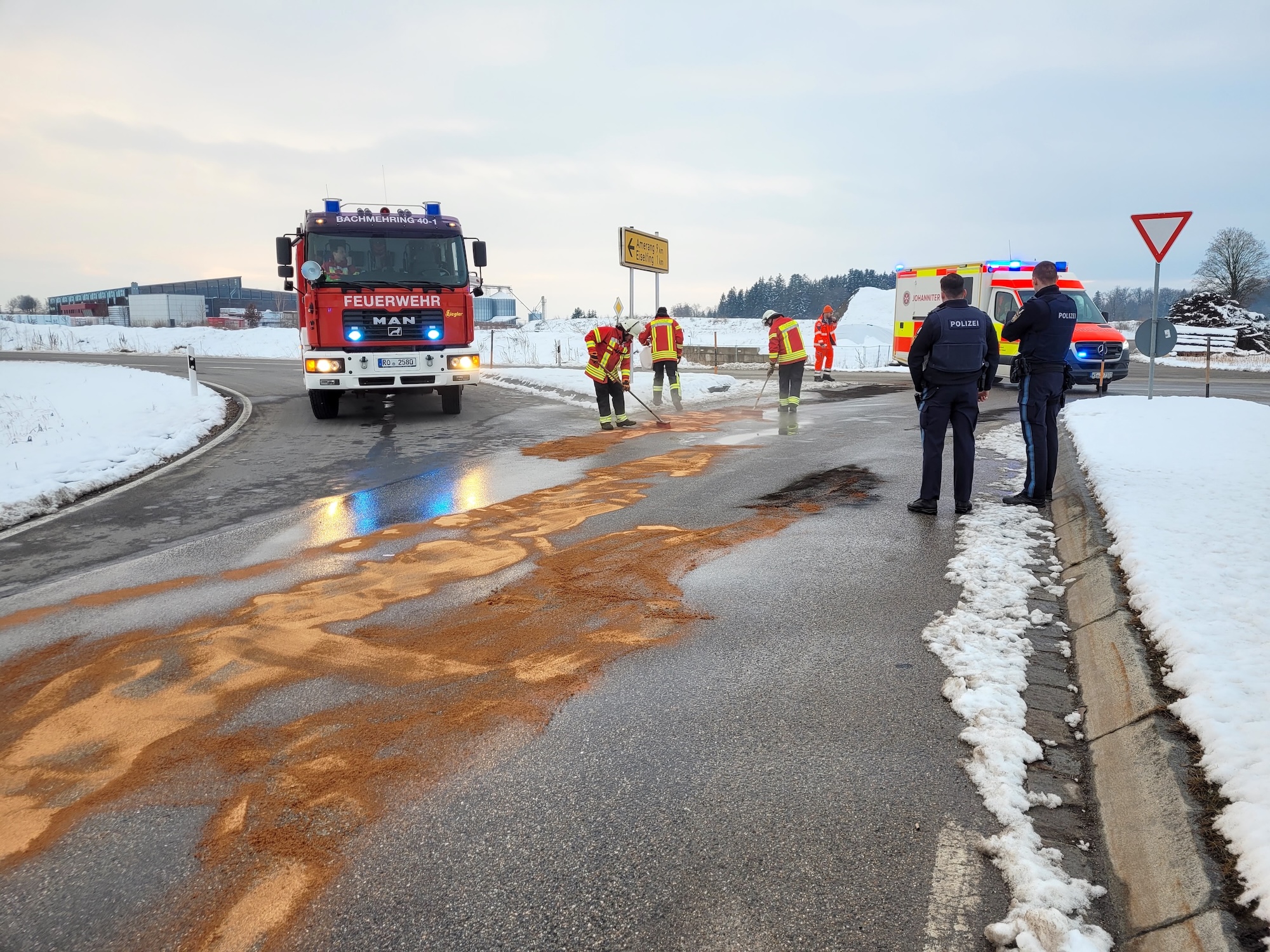Die Feuerwehr Bachmehring wurde heute um 16.58 Uhr zu einer Fahrbahnreinigung an der Kreuzung der Staatsstraße 2092 mit der Kreisstraße 36 bei Eiselfing alarmiert.
